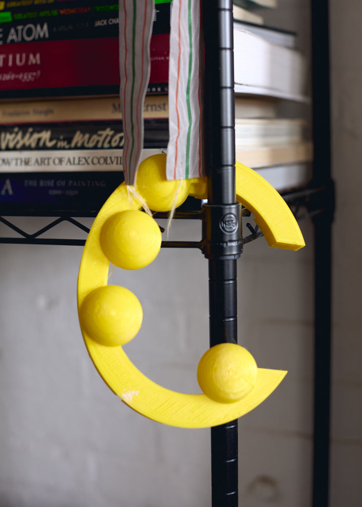 LK There are a lot of circles. It started when I separated a Venn diagram of 3 circles into an ellipsis sign with 3 dots. Then I made the ellipsis piece that has three spheres with symbols punched out. A plus sign on the left sphere, an arrow pointing right in the middle sphere, and a minus sign on the last sphere. They are angled so that light can cast through these holes, reflecting each symbol onto the rest of the painting as pure light. So each day passes, light shines across the painting and casts the images onto its surface. Similar to the cracking clay, it’s an event that happens independently of being seen.