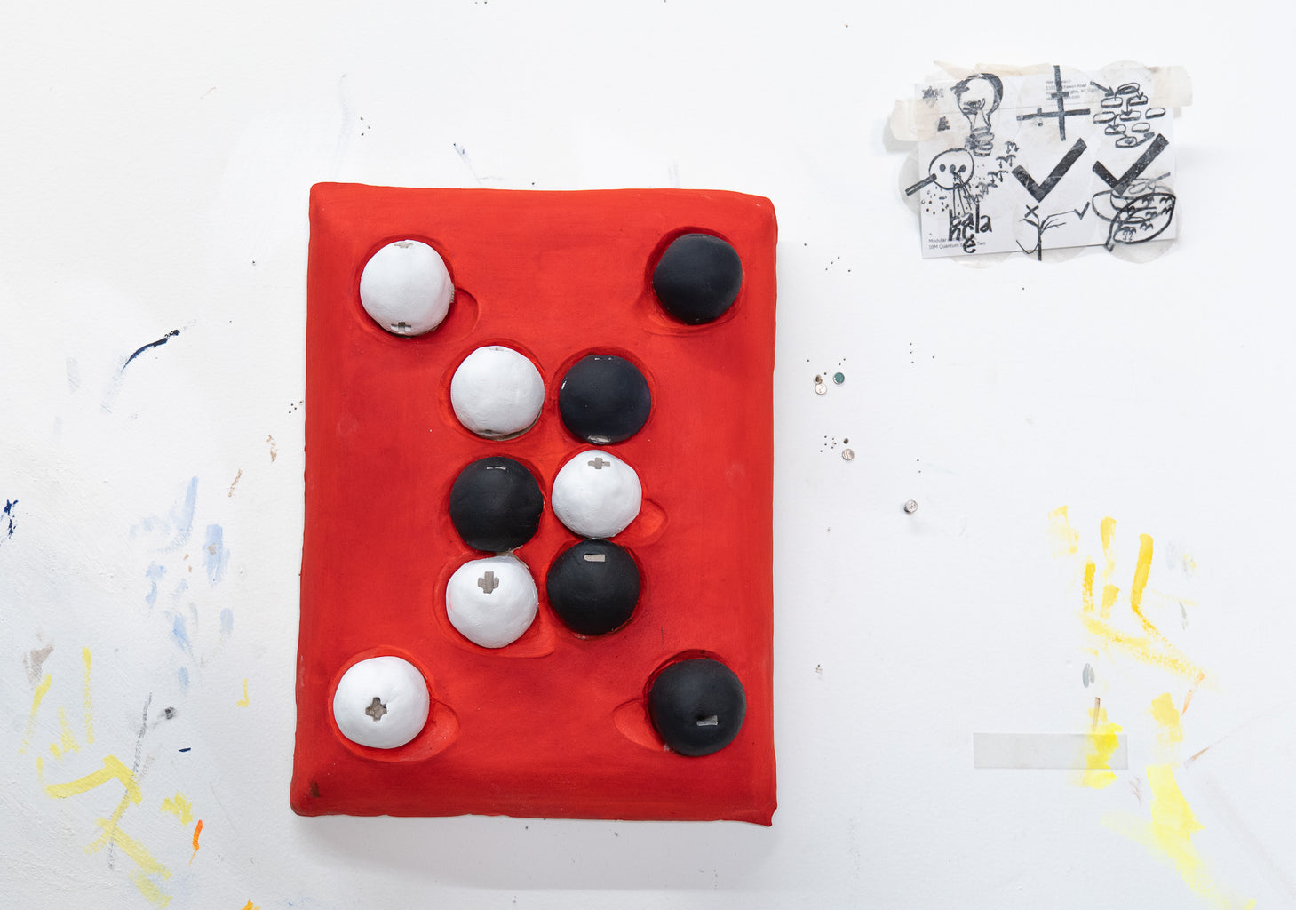 LK I am still learning from clay, and there are outcomes specific to the material, such as the range of colors that happen when playing with the pressure and dry time. I used this effect with this piece, Tavla. I set up a game of backgammon on the wet clay surface, so the circles on it are the marks from the real game pieces. I recorded where and who rolled each number. But all the clay tones are natural to the clay, real markers of movement with the game pieces adding pressure and creating lighter circles. Seeing the clay as another way for the paintings to be events in themselves, markers of interaction with some outcomes left to chance.